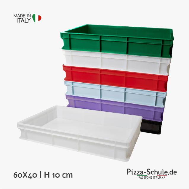 Professionelle Pizzaballenbox 40 x 30 x 10 cm für die perfekte Teigaufbewahrung zu Hause oder in der Pizzeria. Stapelbar, lebensmittelecht, Made in Italy. Ideal für Stockgare, Stückgare und Biga. Erhältlich in Weiß, Rot, Grün, Hellblau, Lila und Schwarz.